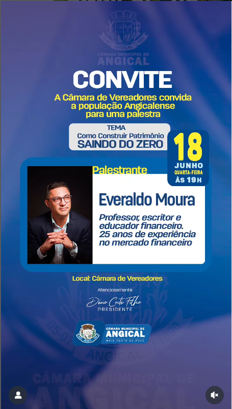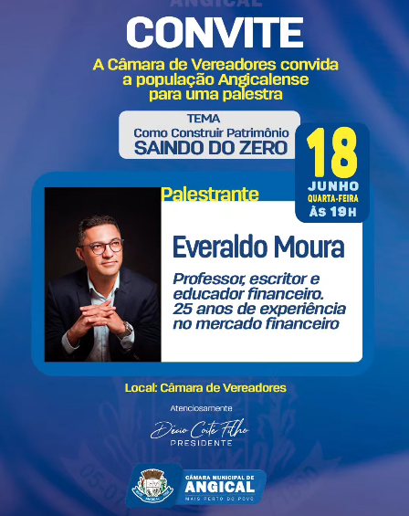 | CONVITE PALESTRA TEMA: Como Construir Patrimônio SAINDO DO ZERO | 12/06/2025 | A Câmara de Angical convida toda a população para uma palestra.Palestrante: @everaldomoura_financasTEMA: Como Construir Patrimônio SAINDO DO ZERO.LOCAL: Câmara de Vereadores DIA 18 de junho (quarta-feira) as 19h.VENHA… PARTICIPE! |