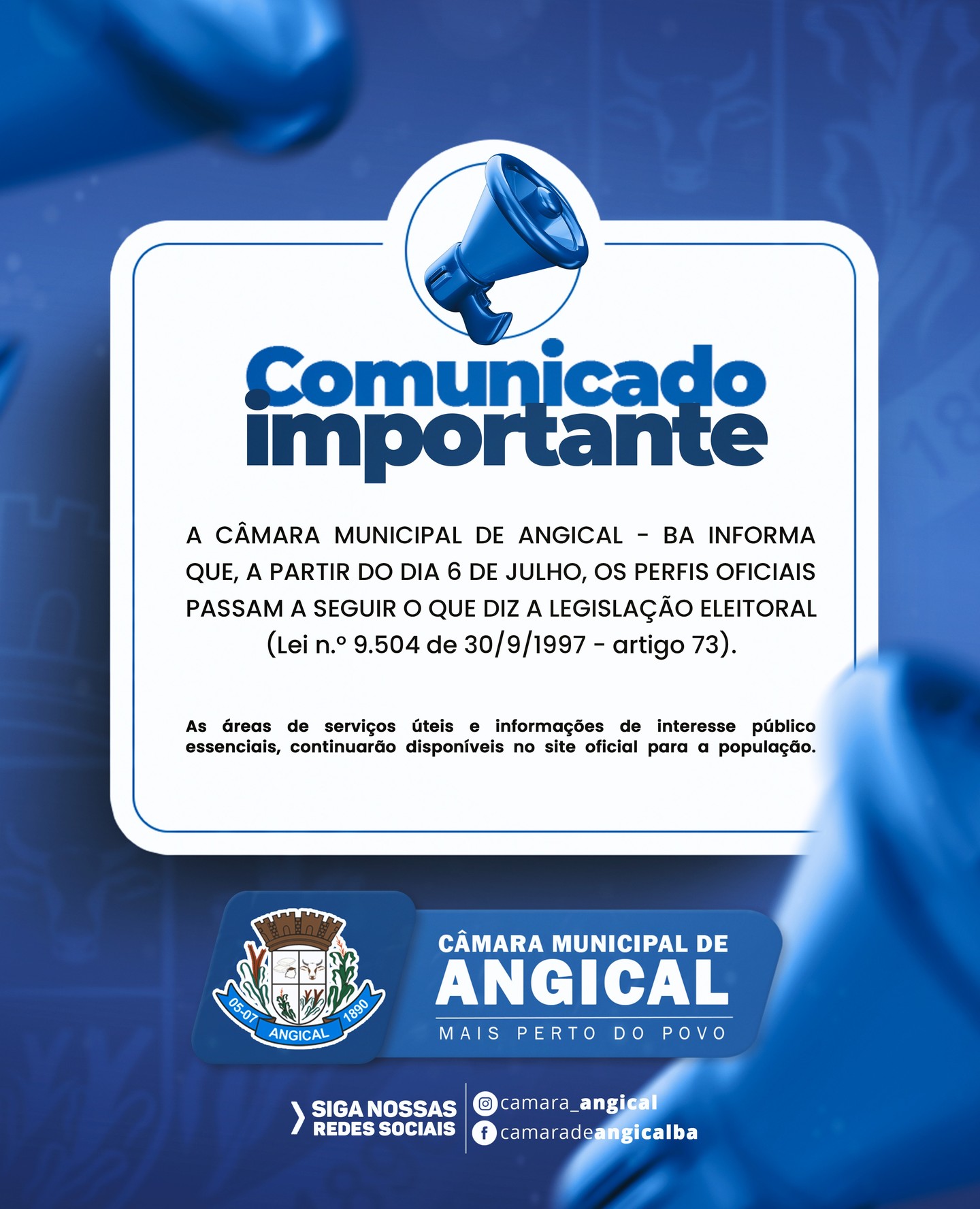 | COMUNICADO IMPORTANTE! ⚠️ | 06/07/2024 | Informamos que as atividades desta conta serão suspensas a partir do dia 6 de julho de 2024, em conformidade com a legislação eleitoral (Lei n° 9.504 de 30/9/1997, artigo 73). Para informações sobre serviços essenciais, acesse nosso site oficial: https://cmangical.ba.gov.br/ | |